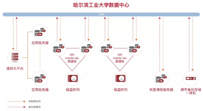 鼎甲結合哈工大的數據保護需求,提供基于鼎甲備份存儲一體機(InfoKist)的解決方案。對哈工大重要業務系統的Oracle RAC數據庫實行時間策略每周全量、每天增量的自動化的全面高效的在線熱備份。對VMware虛擬機實行時間策略每周全量備份、每周增量的自動化的全面高效的在線熱備份。